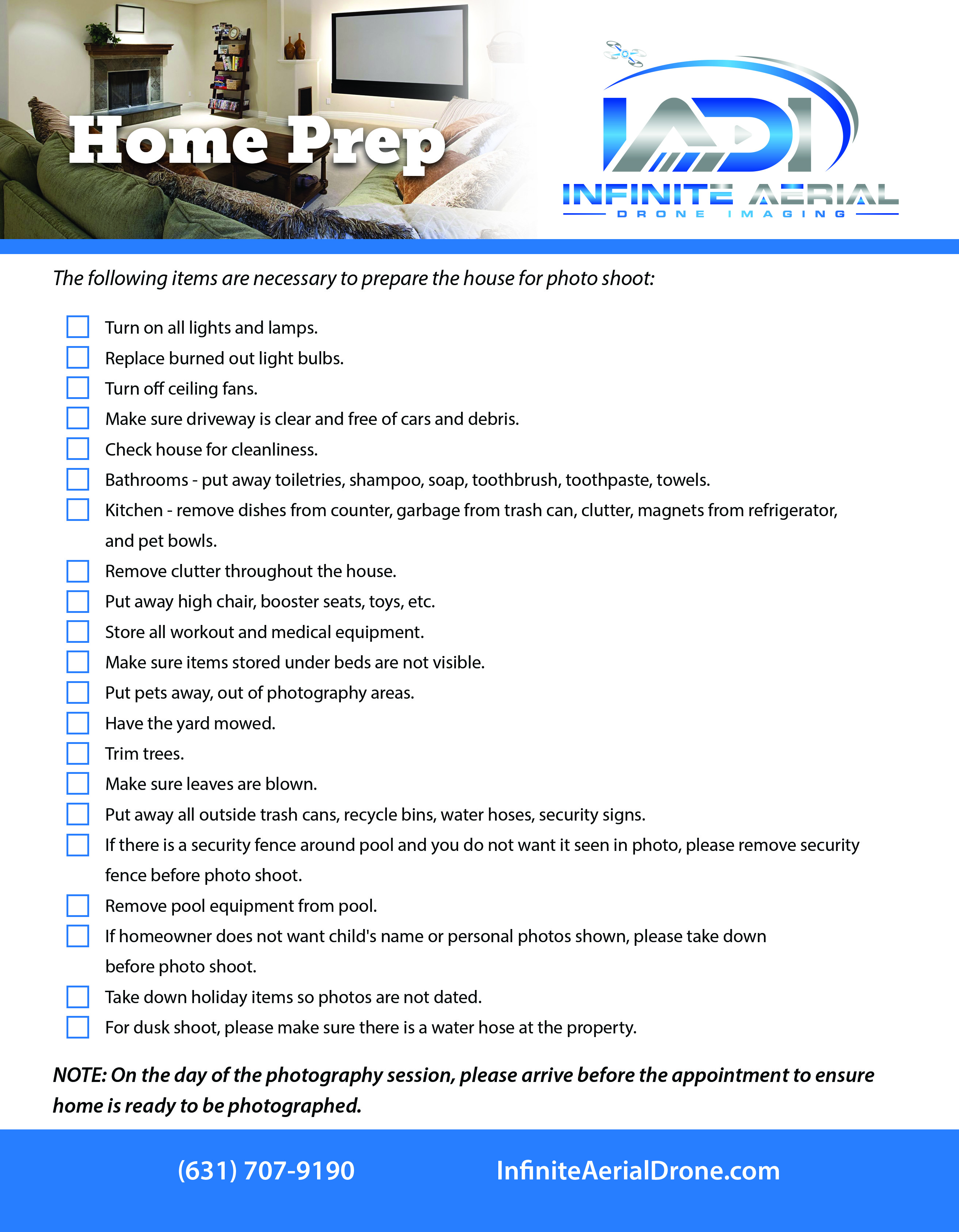 After setting an appointment with Infinite Aerial Drone Imaging, please review the home preparation flyer to ensure your property is ready for the photo shoot. Here you will see all those requirements for photography